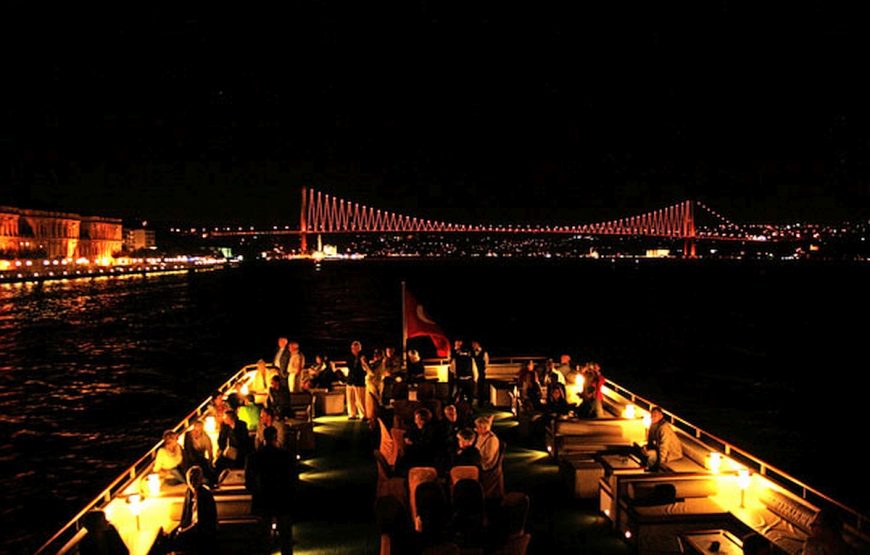 Enjoy as you cruise The Bosphorus and see historical places like Dolmabahce Palace, Bosphorus Bridge, Ortakoy, Rumeli Forthress , Fatih Bridge , Beylerbeyi Palace, Maiden’s Tower and also Istanbuls very famous night clubs as you wine and dine the night away.